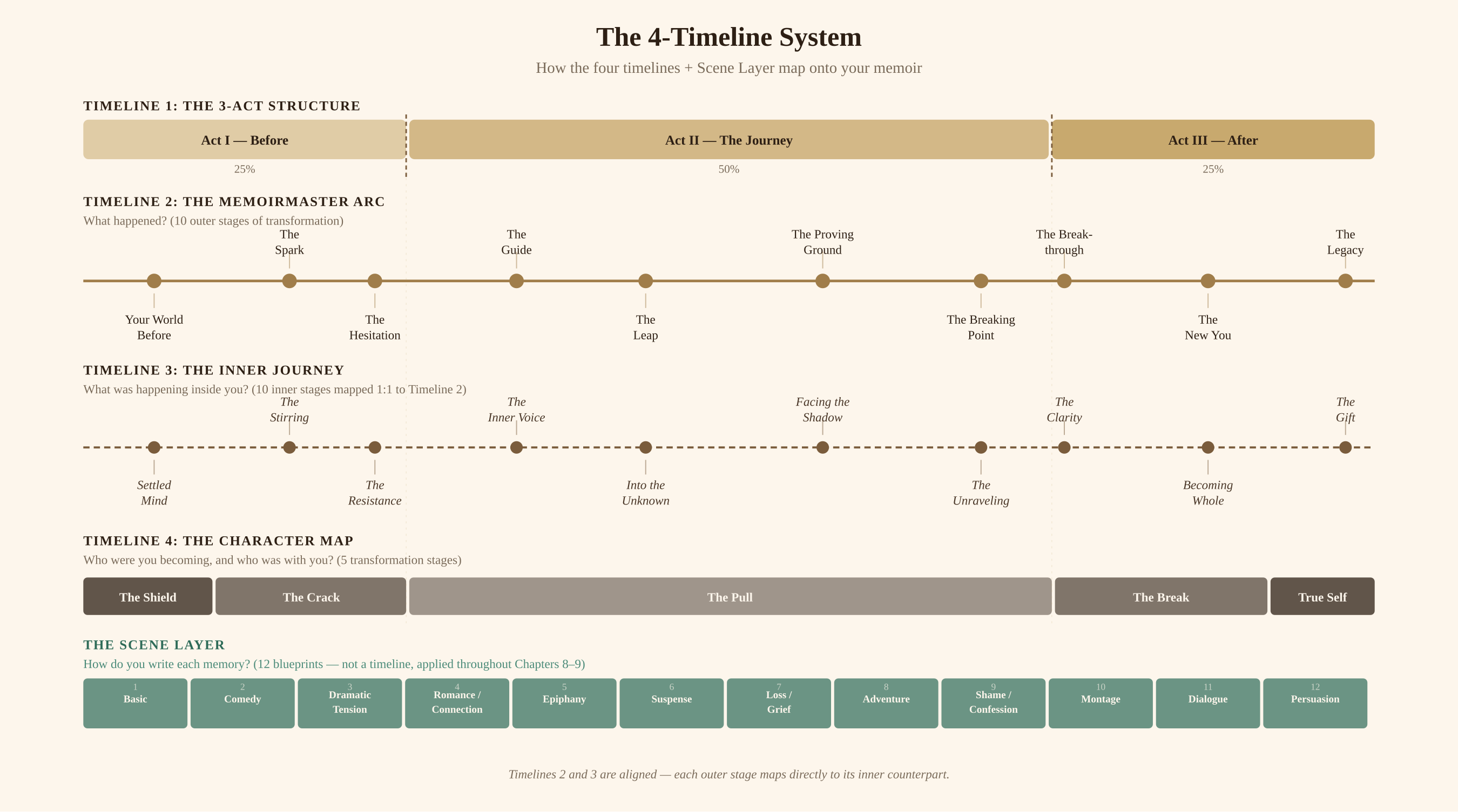 How the four timelines and the Scene Layer work together to build a complete memoir.