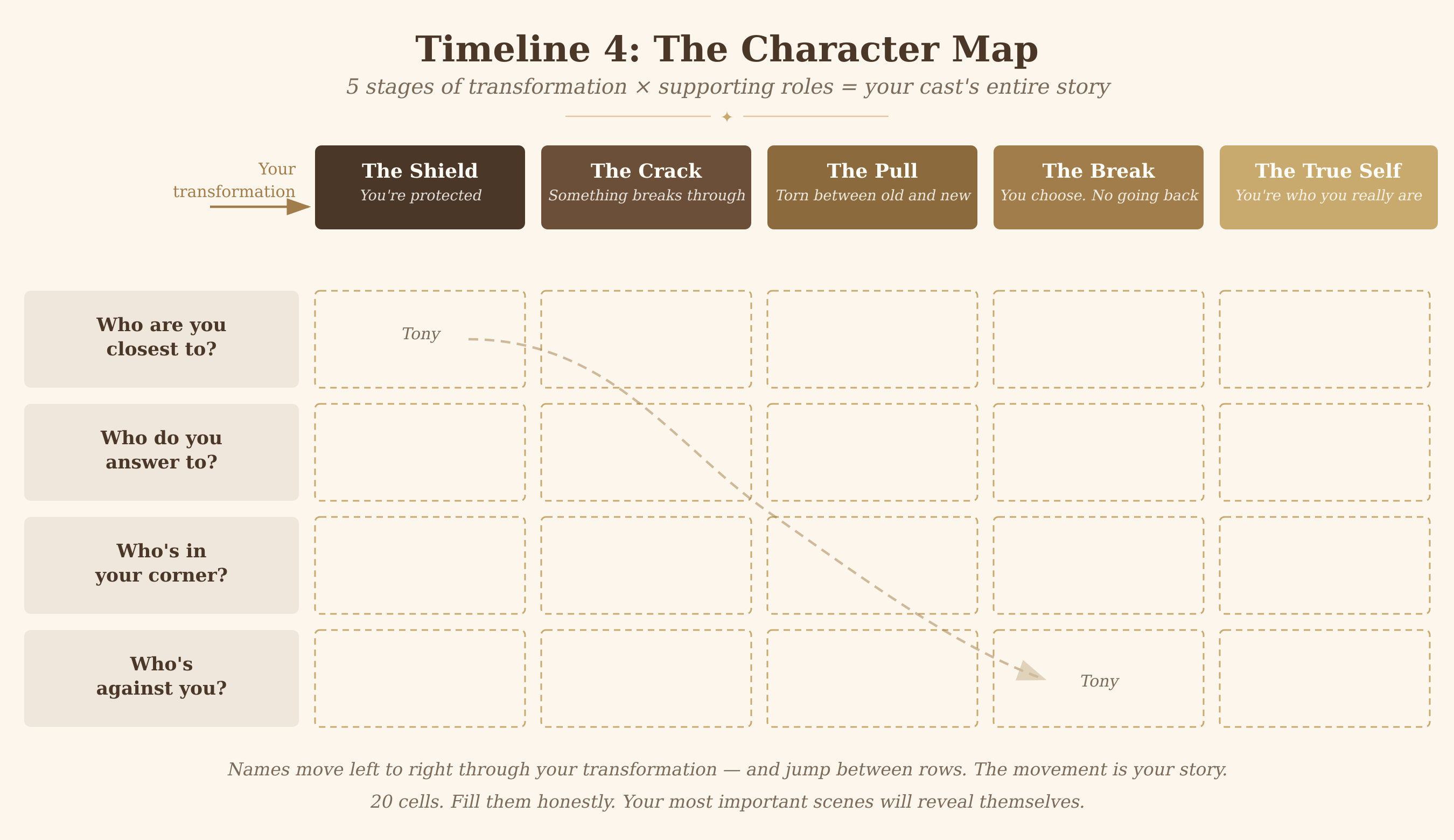 Your transformation across five stages, and the people around you at each one — who was closest, who you answered to, who supported you, and who stood against you.