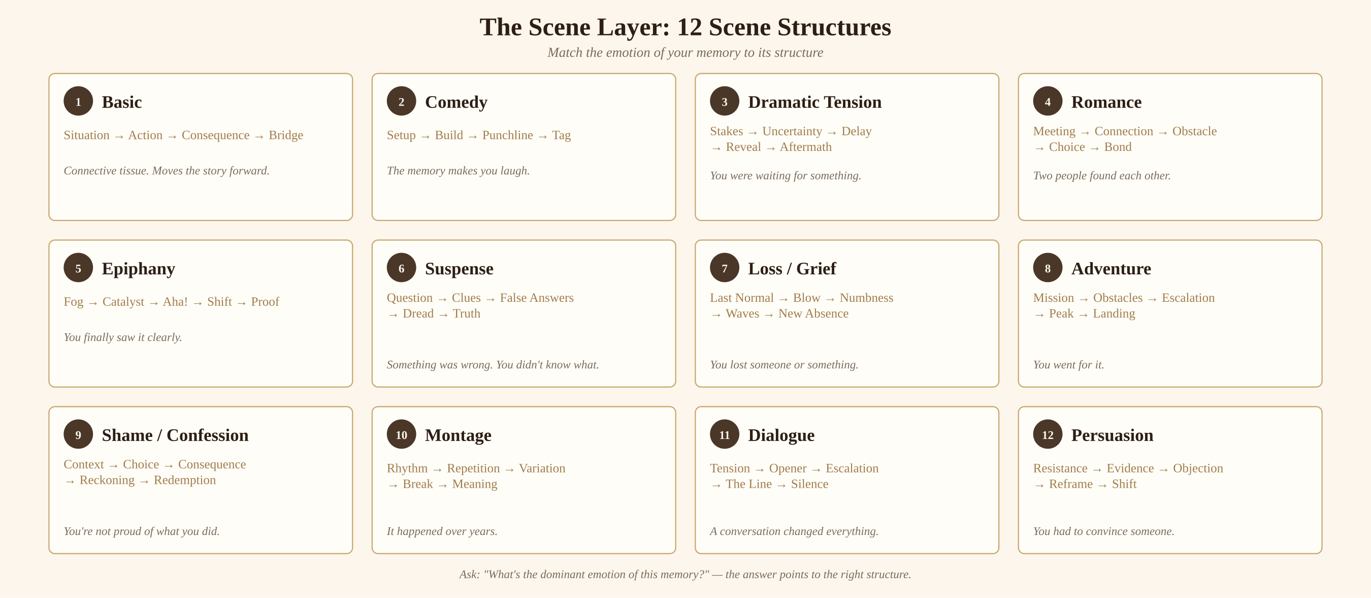 The twelve scene blueprints — each one designed for a specific kind of memory and emotional effect.