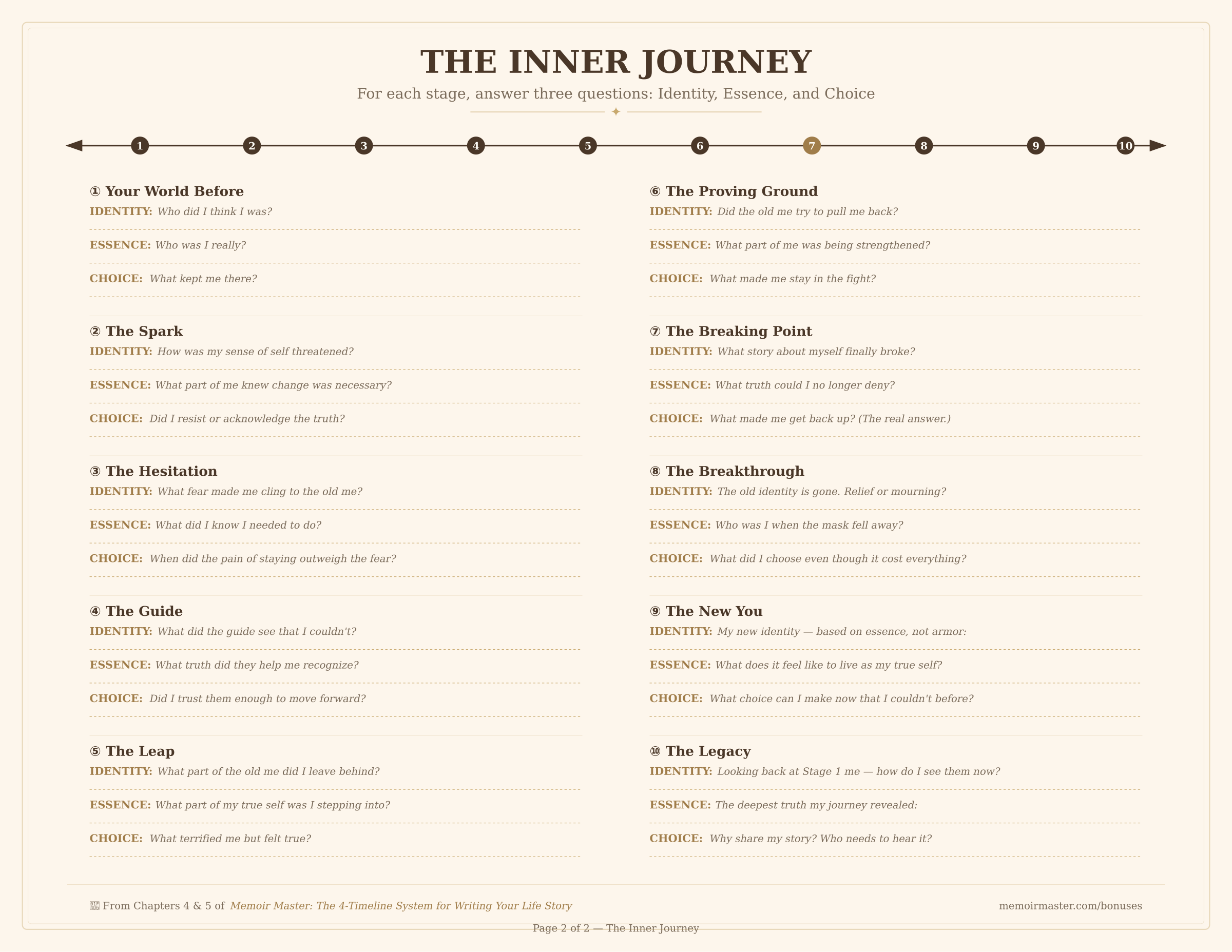 The worksheet is intentionally simple. Ten stages. Three questions each. One column for scenes. Everything you need to plan a complete memoir β on two sheets of paper.